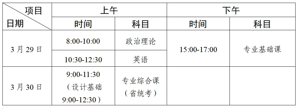 外国语言文学类中非英语类专业的专业课,以及院校自行组织命题的专业综合课科目,由招生院校自行组织,考试时间由院校在省招生办规定的时间范围内自行决定并通知考生。 “设计基础”考试注意事项:1.答卷纸和草稿纸由考场提供;2.考生自带设计作图用具和材料;3.考生自带画板或画夹,要求不大于4开并且干净(无任何图案、图形等痕迹);4.除圆规、直尺、三角板之外,禁止携带任何其他辅助制图工具。